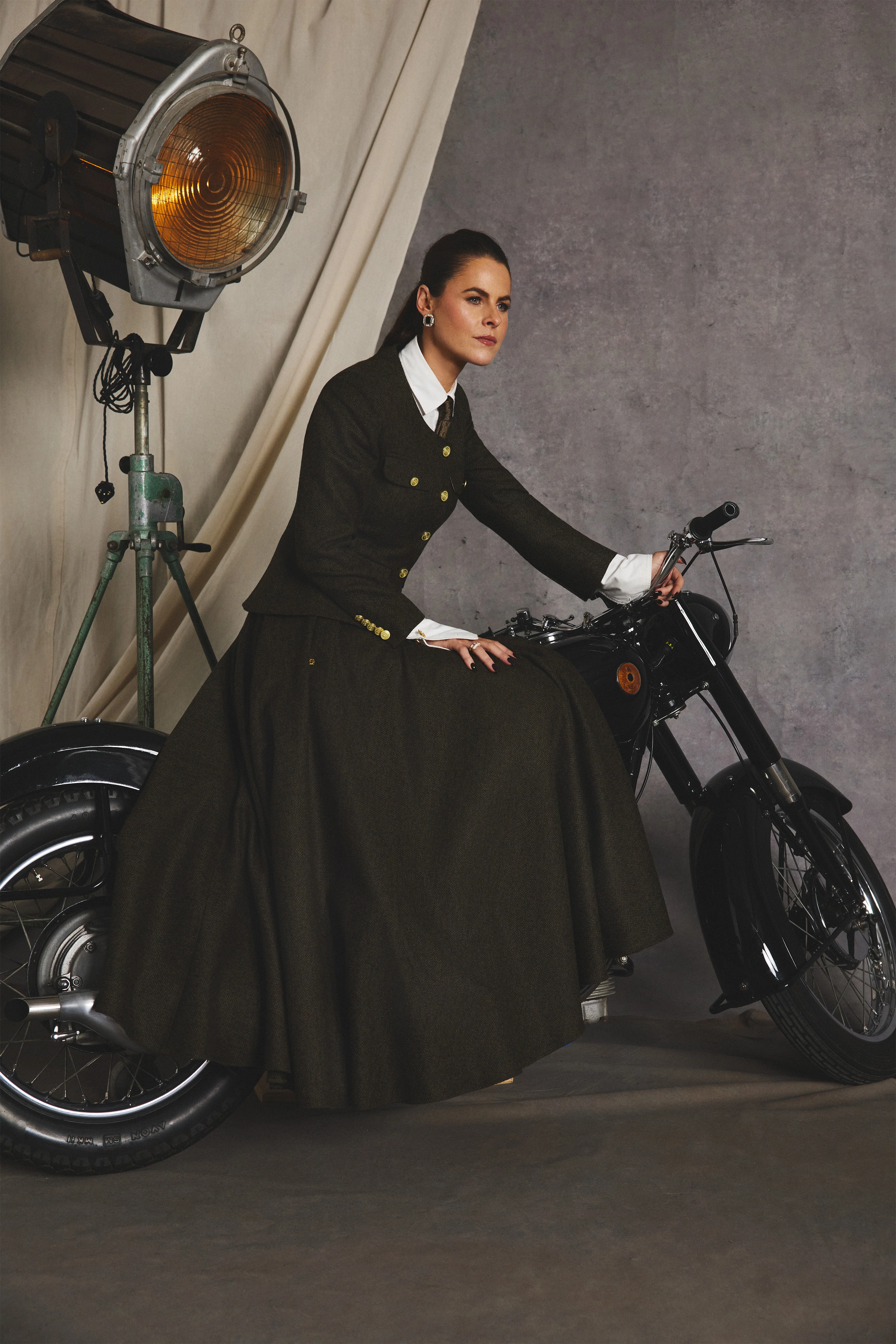 Designed in a deep, rich green herringbone tweed, it’s the epitome of countryside elegance. This particular shade of dark green herringbone draws inspiration from the rolling hills and deep moss tones of the British countryside in late winter - where rich earth meets evergreen hedgerows. A tribute to the traditional hunting fields and heritage tweeds worn for centuries, reimagined with a feminine edge.