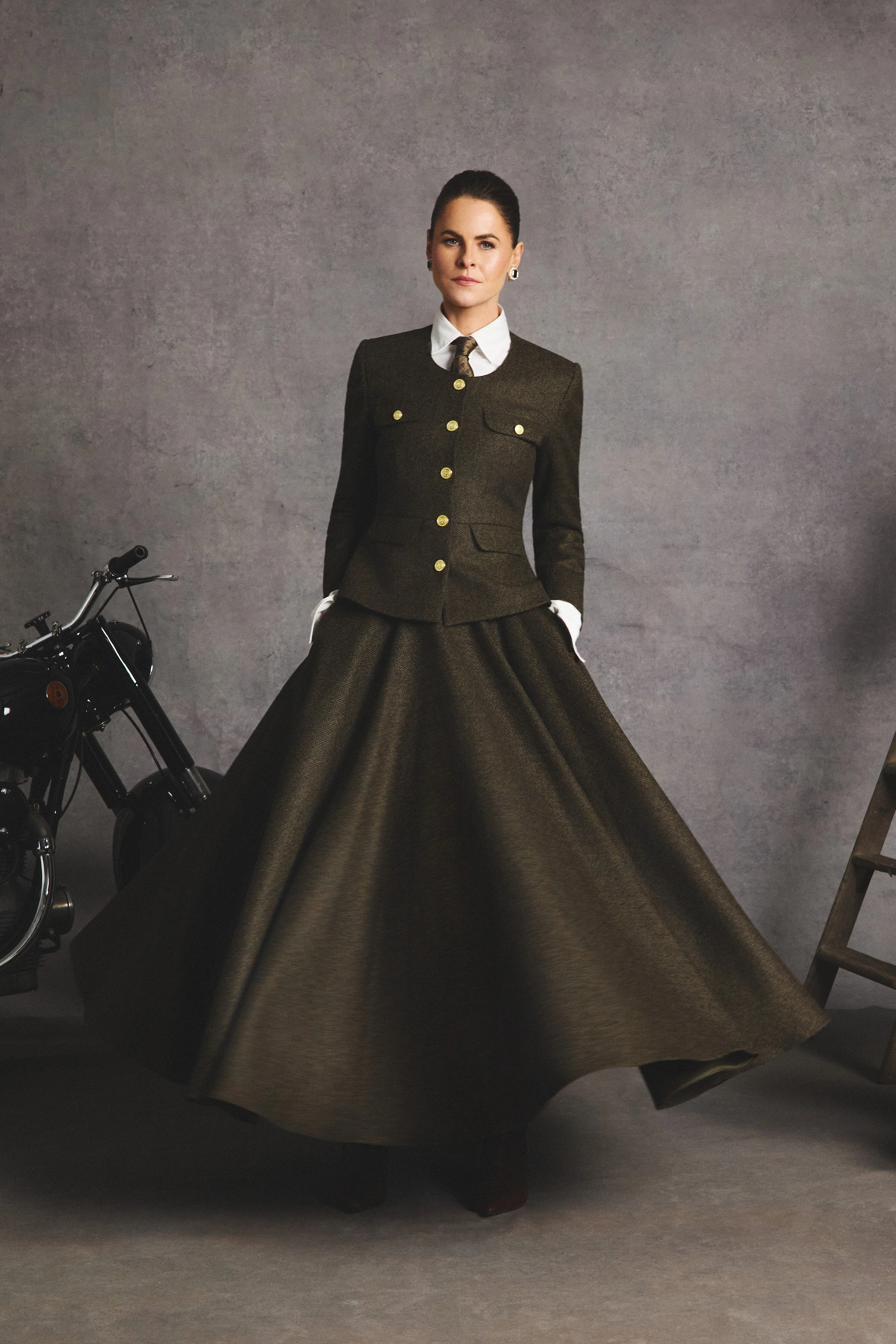 Designed in a deep, rich green herringbone tweed and finished with our signature gold crested buttons, it’s the epitome of countryside elegance. This particular shade of dark green herringbone draws inspiration from the rolling hills and deep moss tones of the British countryside in late winter - where rich earth meets evergreen hedgerows. A tribute to the traditional hunting fields and heritage tweeds worn for centuries, reimagined with a feminine edge. Deep, muted, and versatile - this green was chosen to feel grounded yet quietly commanding, perfect for both grandstands and country walks.